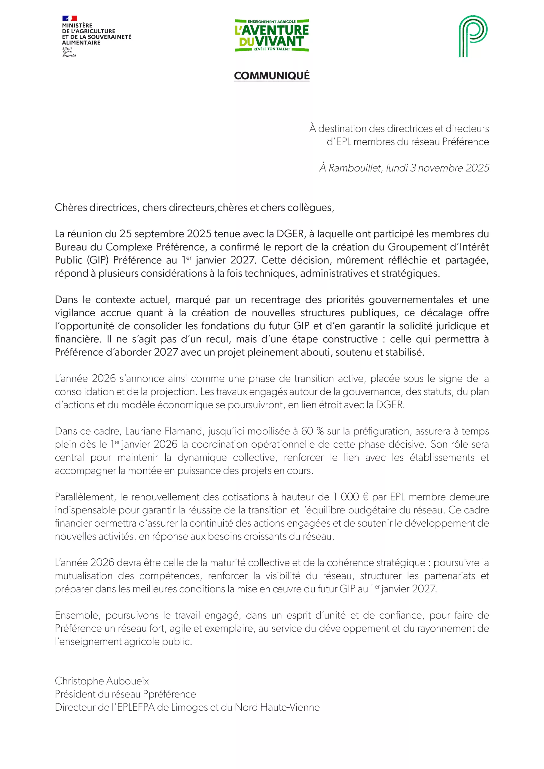 Communiqué relatif au report de la création du Groupement d’Intérêt Public (GIP) Préférence